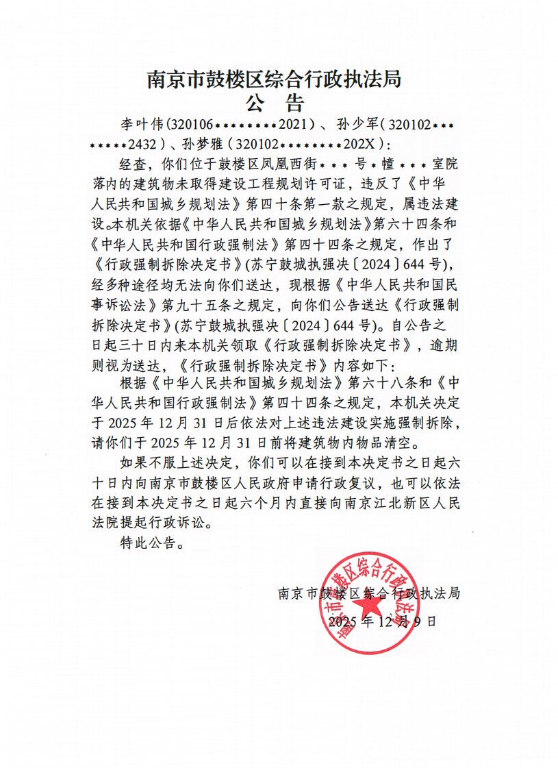 南京市鼓楼区综合行政执法局公告