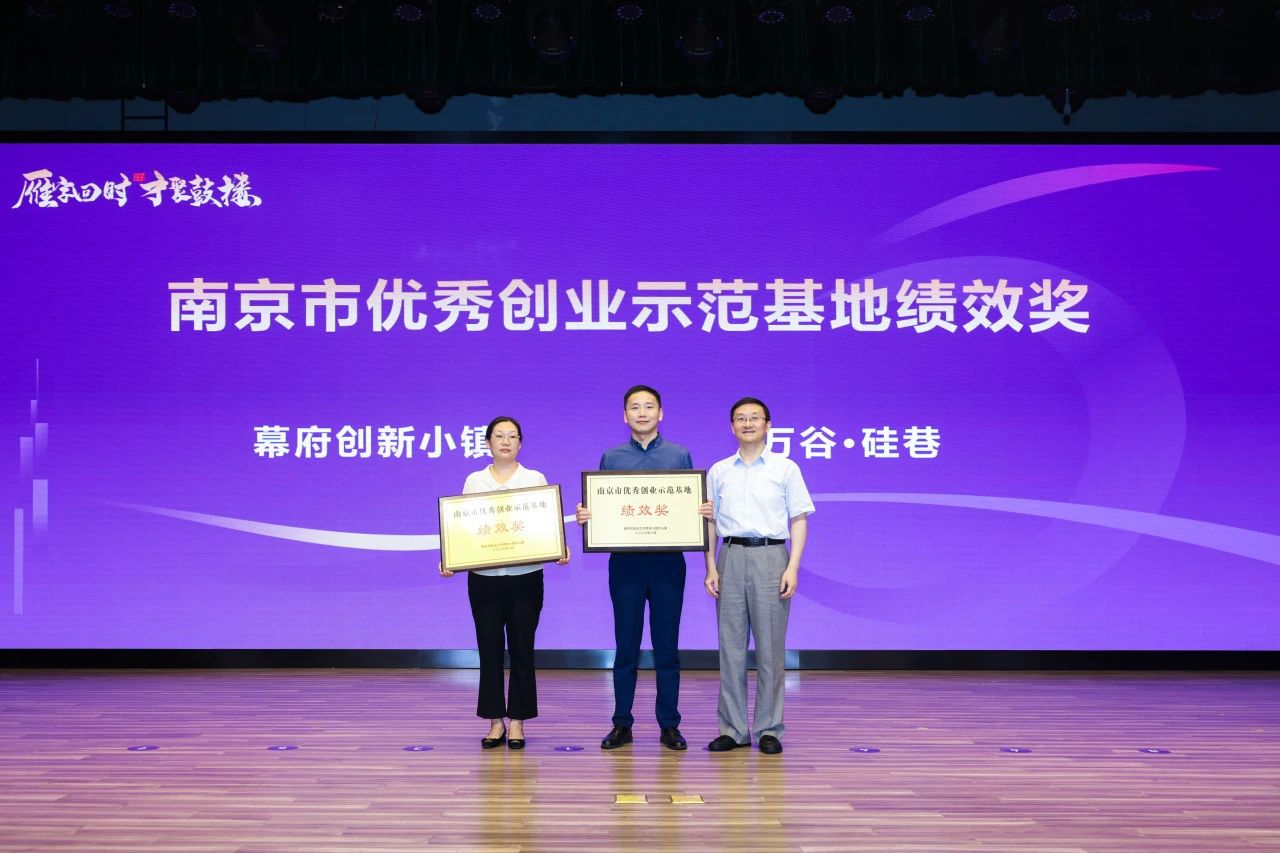 南京市人力资源和社会保障局党组书记、局长刘莅为鼓楼区幕府创新小镇、万谷硅巷2家园区颁发南京市优秀创业示范基地绩效奖励。