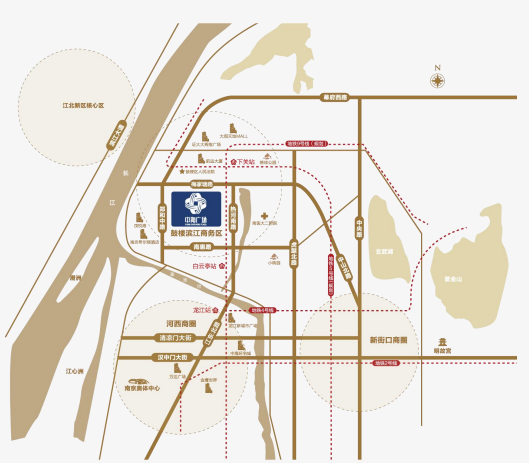 双线地铁:5号线、9号线(在建),下关站、白云亭站、三汊河站步行时间约5分钟 地面交通:定淮门长江隧道、建宁西路过江通道( 在建)、热河南路、江东北路等8条主干道公交站点(100米内>10个) 交通枢纽:南京站(约15分钟)、南京南站(约30分钟)、禄口机场(约40分钟) 江岸的呼吸:推窗见江,是这里许多办公空间的“标配”。开阔的视野,最能激发开阔的思路。