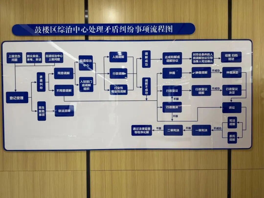 这不仅仅是部门的物理集中,更是政法资源和社会力量的功能聚合,这种布局确保了简单矛盾快速化解、专业问题对口解决、复杂纠纷协同攻坚。 机制赋能 构建“全链条”化解闭合环 实体平台是“躯干”,工作机制则是“神经中枢”。鼓楼区综治中心创新构建了一套权责清晰、环环相扣的制度体系,确保每一起纠纷都能进入最合适的解决轨道。 智能“分诊” 精准导流第一关 面对纷繁复杂的诉求,中心首先依据一套精细的矛盾纠纷分类流转规则进行精准“分诊”:该属事部门处理的快速交办;涉法涉诉的导入司法程序;重大群体性的落实综合处置;而那些跨辖区、跨部门、涉政策的“疑难杂症”,则被标识出来,准备启动更高级别的处置程序。